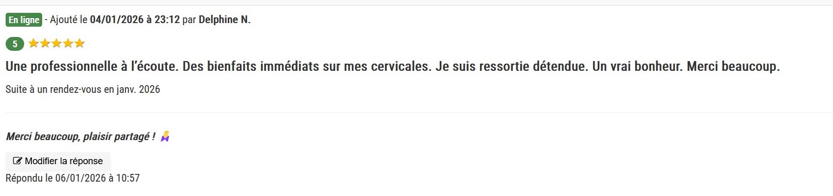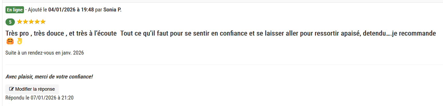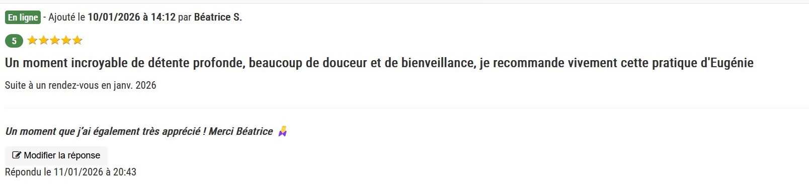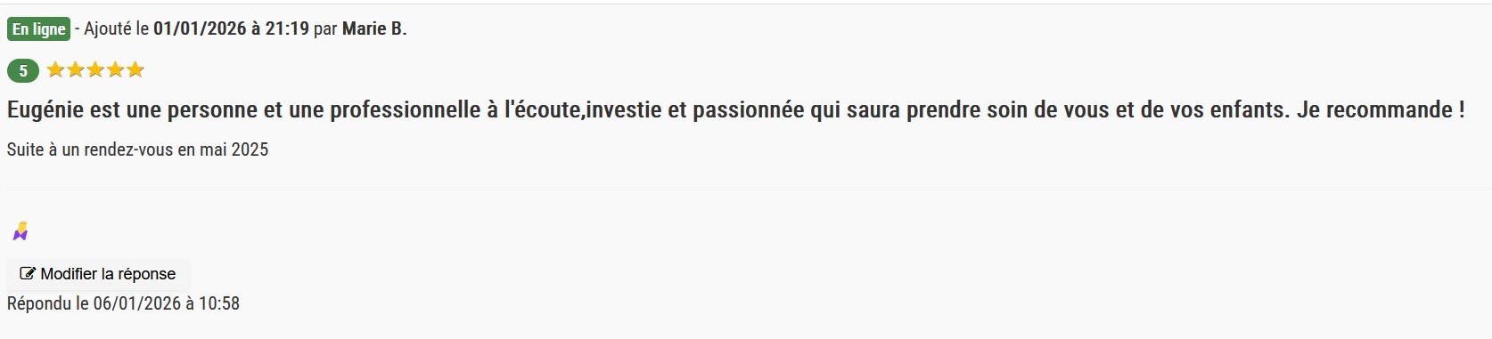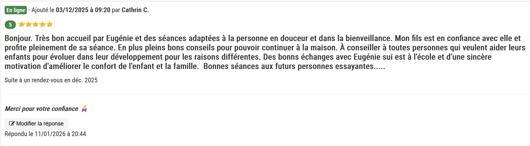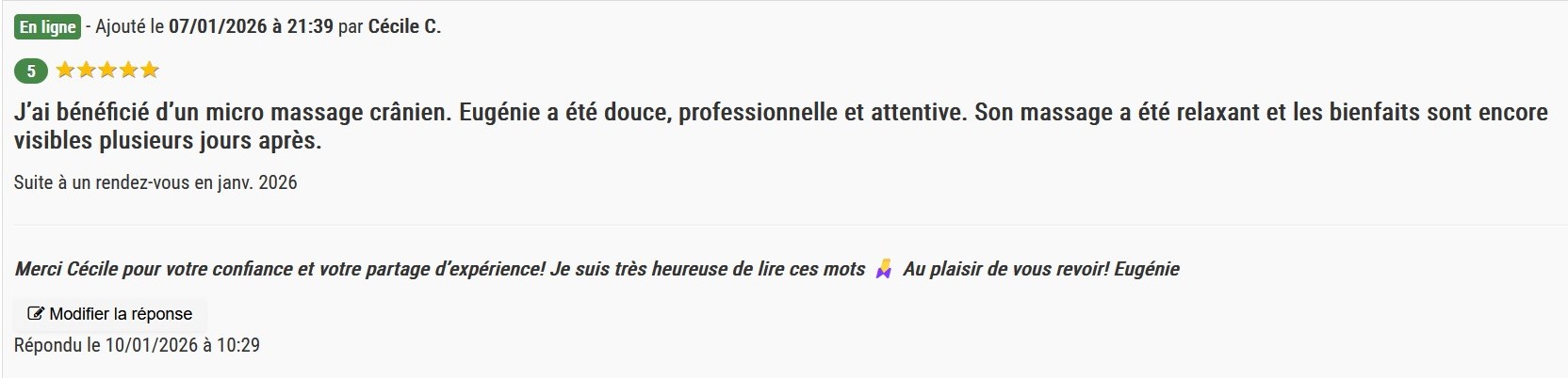 Ayant souffert de tête persistants, j'ai eu la chance de bénéficier des soins d'Eugénie et les résultats ont été très bénéfiques. Son approche est à la fois douce et profondément efficace ; Eugénie sait créer une atmosphère de relation qui permet de relâcher les tensions et d'apaiser le corps. Son écoute et son savoir-faire m'ont permis de retrouver un bien-être réel. Que ce soit pour des douleurs spécifiques ou une séance de détente, je ne peux que recommander Eugénie, les yeux fermés. Un très grand MERCI